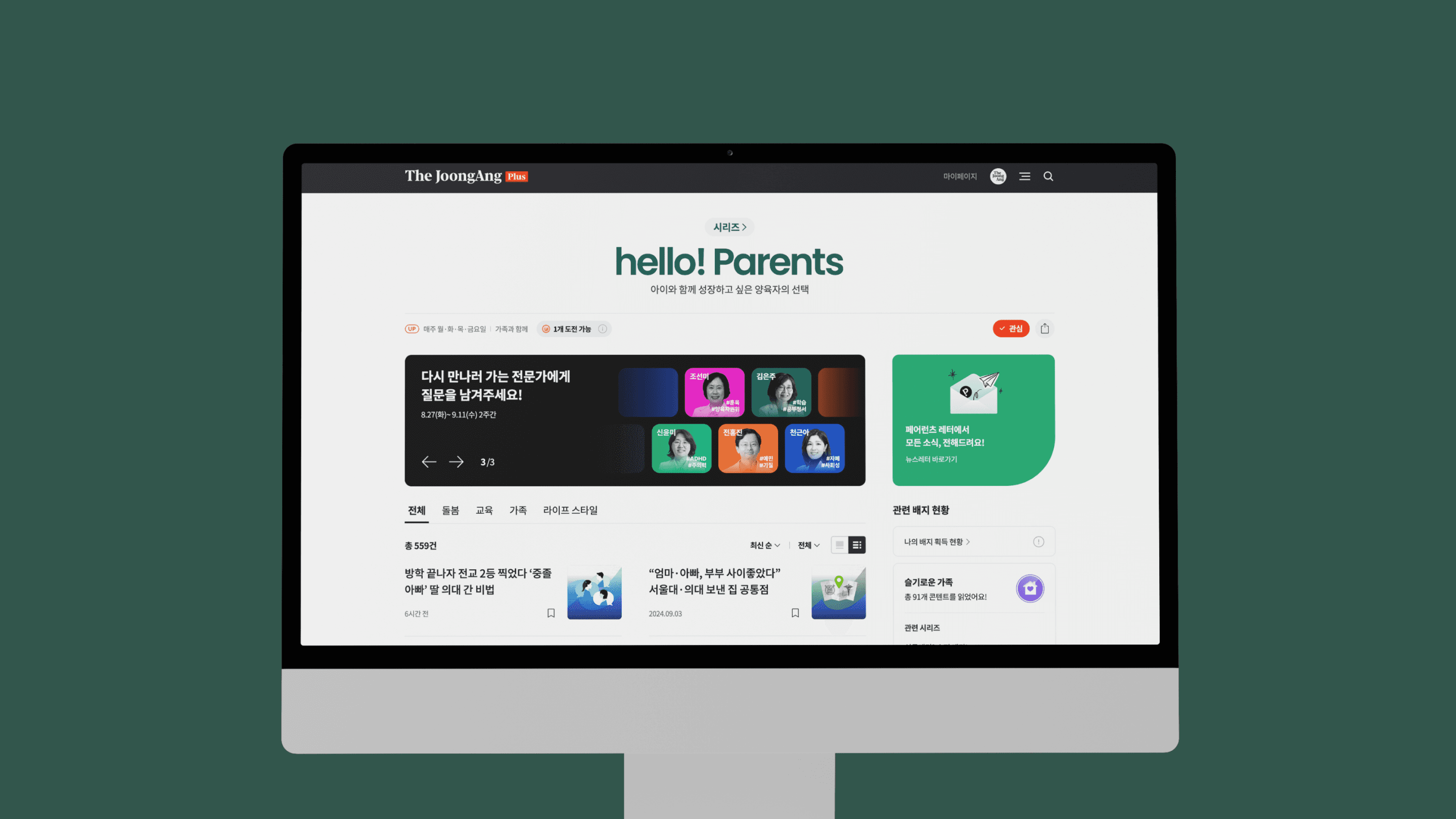 헬로! 페어런츠는 더중앙플러스의 대표 1위 시리즈로, 양육자를 위한 다양한 콘텐츠를 다루었습니다.